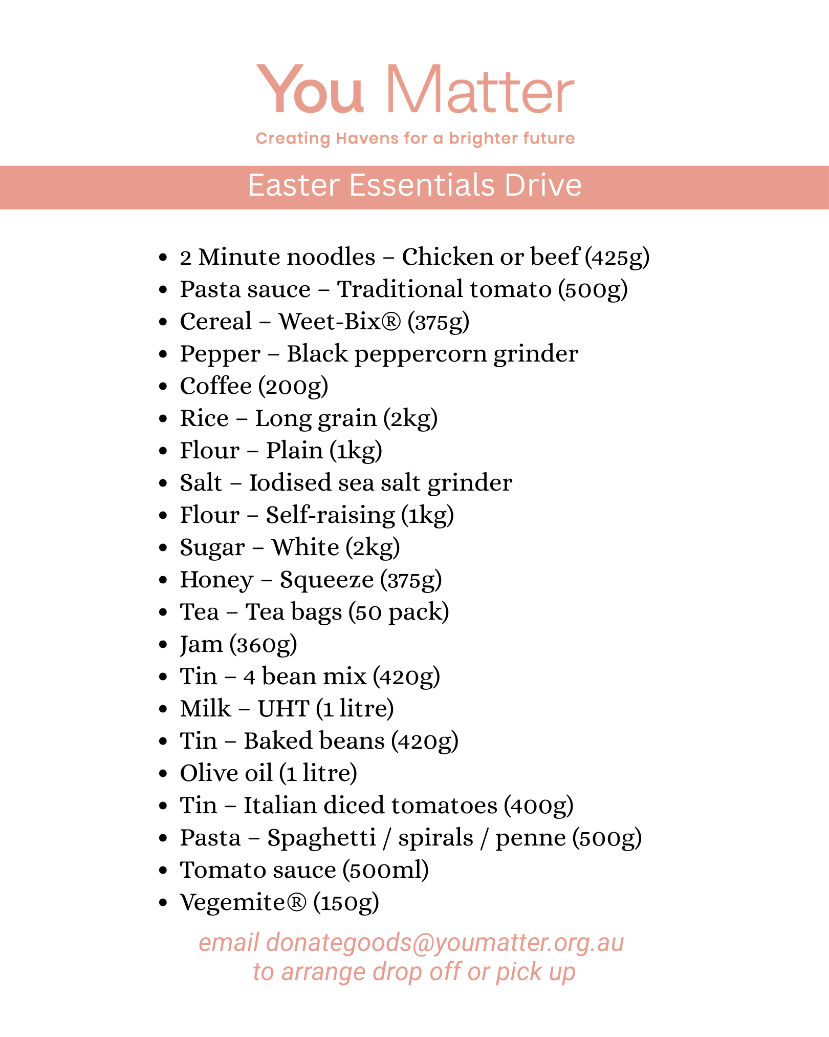 This Easter, You Matter is inviting local communities, workplaces and supporters to take part in our Easter Essentials Drive, helping to stock Havens with basic pantry items that families rely on every day.