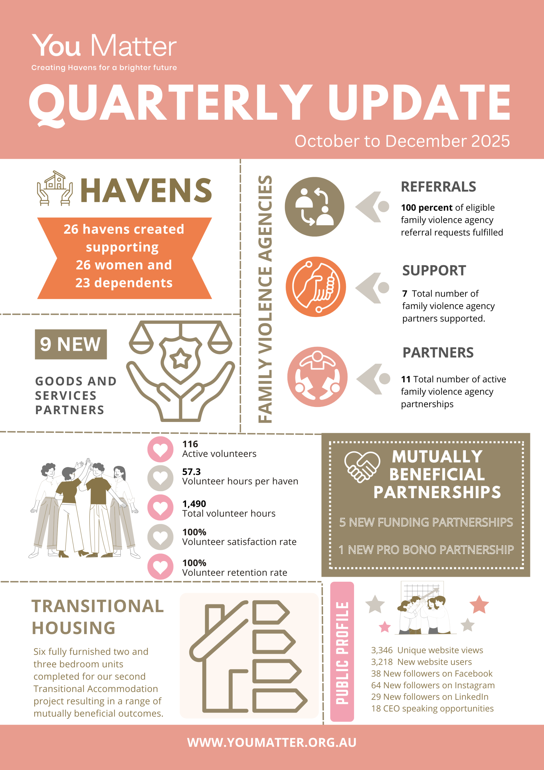This year’s Annual Report reflects a period of deepened impact and strong foundations for growth at You Matter. From creating 84 Havens to launching our Transitional Accommodation Program, we focused on what works while expanding our ability to support women and children recovering from family violence. Strengthened partnerships, clearer impact measures, and a growing trauma-informed approach have positioned us for the next chapter – one powered by community, evidence, and hope.